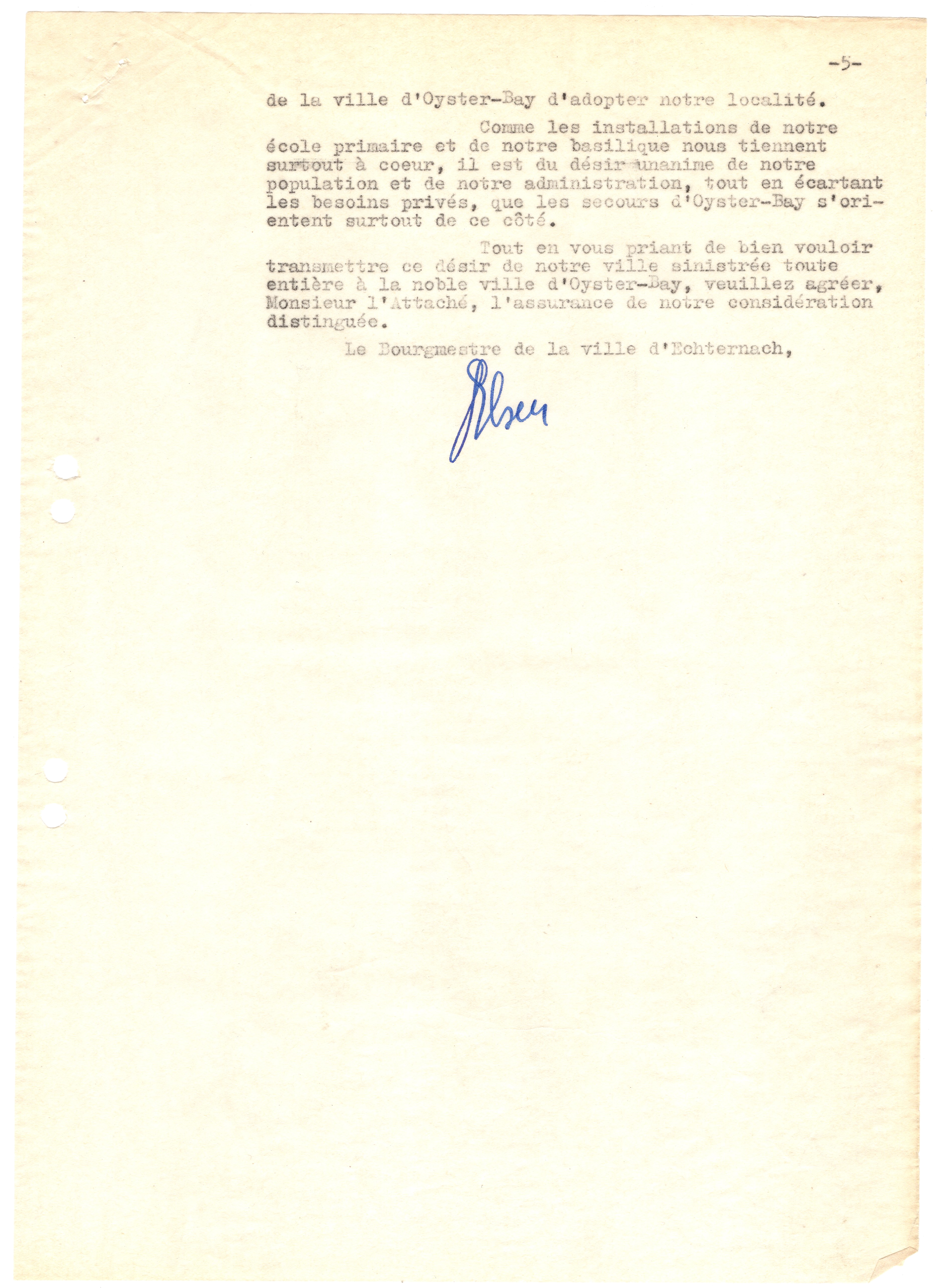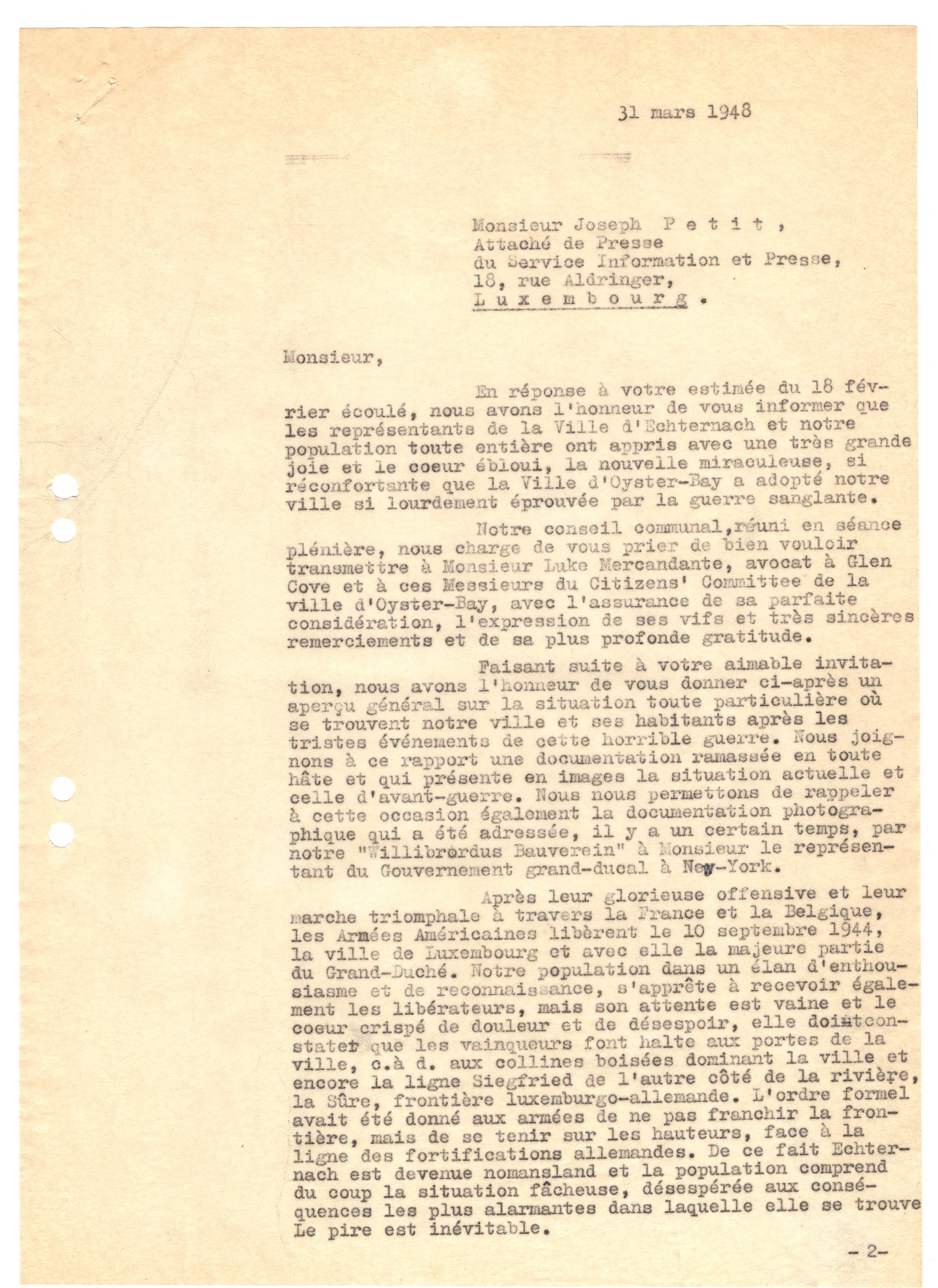 En réponse à votre estimée du 18 février écoulé, nous avons l'honneur de vous informer que les représentants de la Ville d'Echternach et notre population toute entière ont appris avec une très grande joie et le coeur ébloui, la nouvelle miraculeuse, si réconfortante que la Ville d'Oyster-Bay a adopté notre ville si lourdement éprouvée par la guerre sanglante.