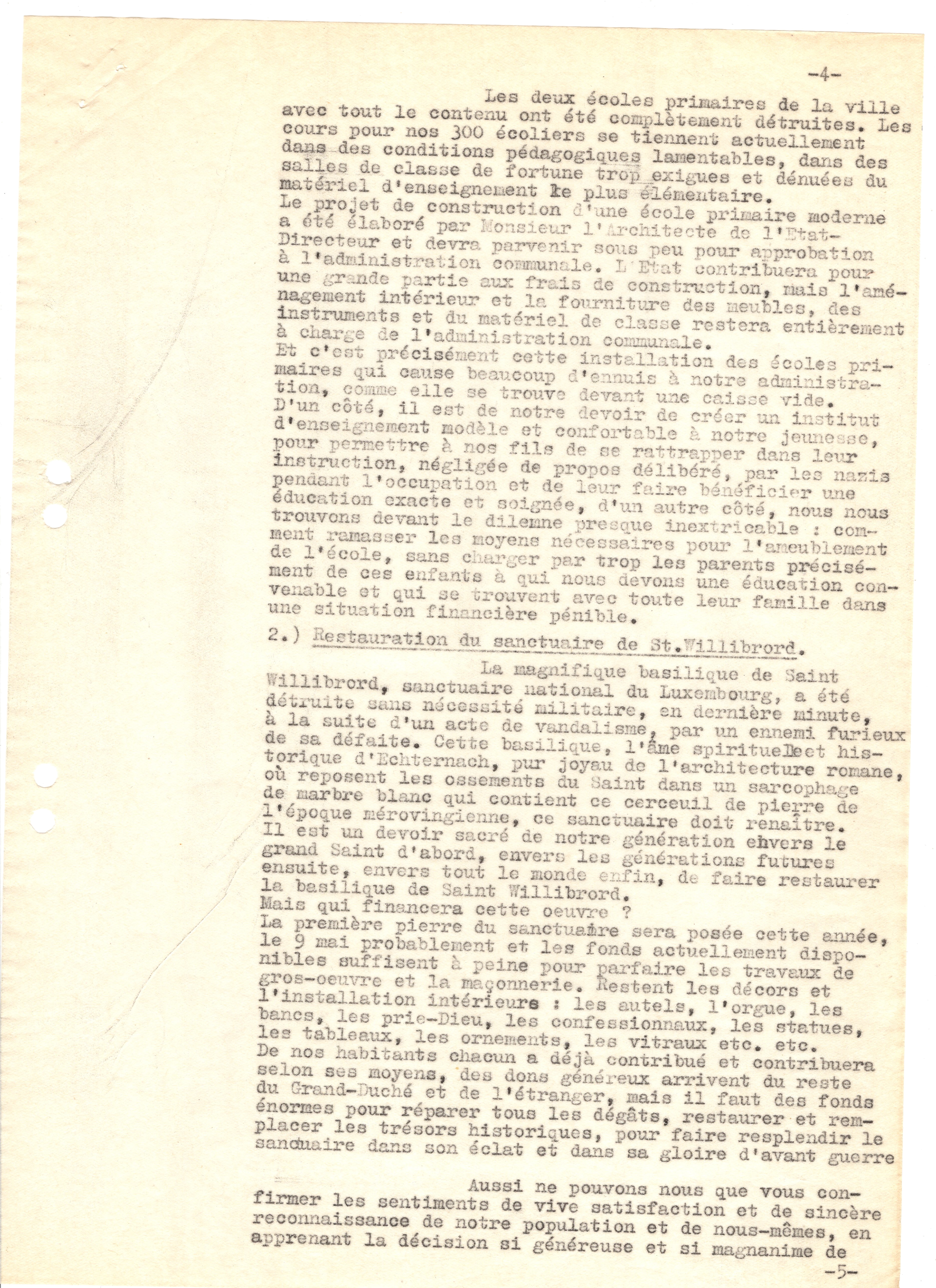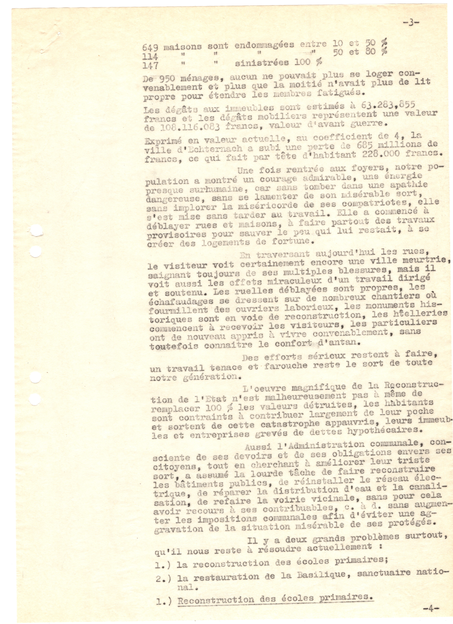 Faisant suite à votre aimable invitation, nous avons l'honneur de vous donner ci-après un aperçu général sur la situation toute particulière où se trouvent notre ville et ses habitants après les tristes événements de cette horrible guerre. Nous joignons à ce rapport une documentation ramassée en toute hâte et qui présente en images la situation actuelle et celle d'avant-guerre. Nous nous permettons de rappeler à cette occasion également la documentation photographique qui a été adressée, il y a un certain temps, par notre "Willibrordus Bauverein" à Monsieur le représentant du Gouvernement grand-ducal à New-York.